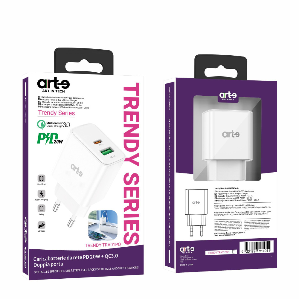 Caricabatteria compatto con doppia porta USB-C e USB-A da 20W, ideale per ricaricare uno o più dispositivi in modo rapido ed efficiente. Perfetto per l’uso quotidiano, offre una ricarica stabile e sicura per smartphone, tablet e altri dispositivi compatibili.