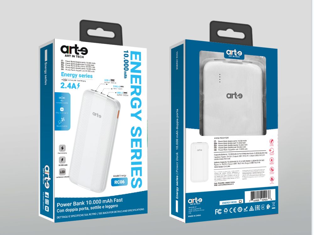 Powerbank da 10000mAh compatto e affidabile, ideale per ricaricare smartphone, tablet e altri dispositivi tramite porte USB-C e USB-A. Perfetto per avere sempre energia extra durante la giornata, ovunque ti trovi.